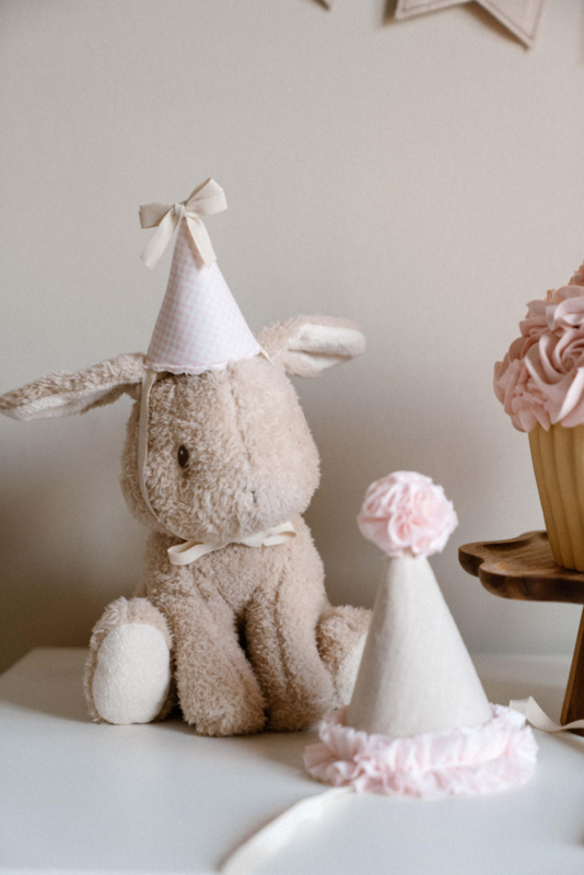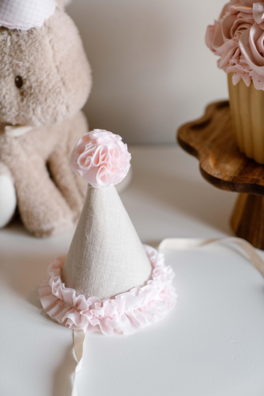 Hoedje Happy BirthdayPrachtig feesthoedje afgewerkt met een sierlijk geschulp randje en luxeuze satijnen strik.In kleurcombinatie naar wens.
